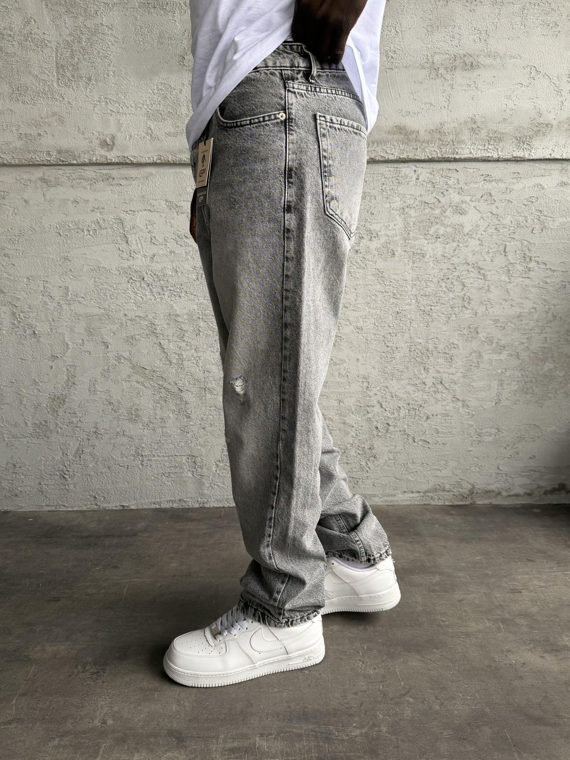 - Gri Taşlamalı Yırtıklı Baggy Jean