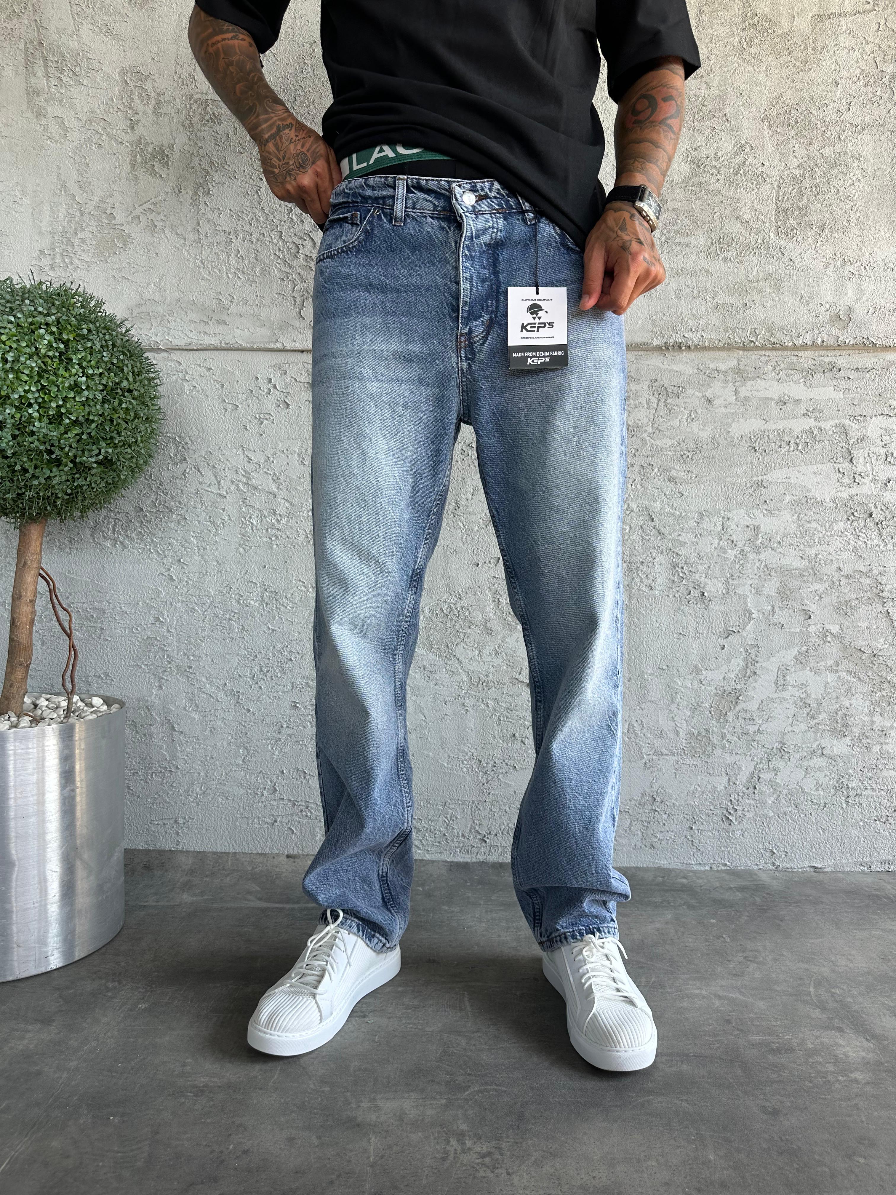 Koyu Lacivert Yıkamalı Yırtıklı Mavi Baggy Jean