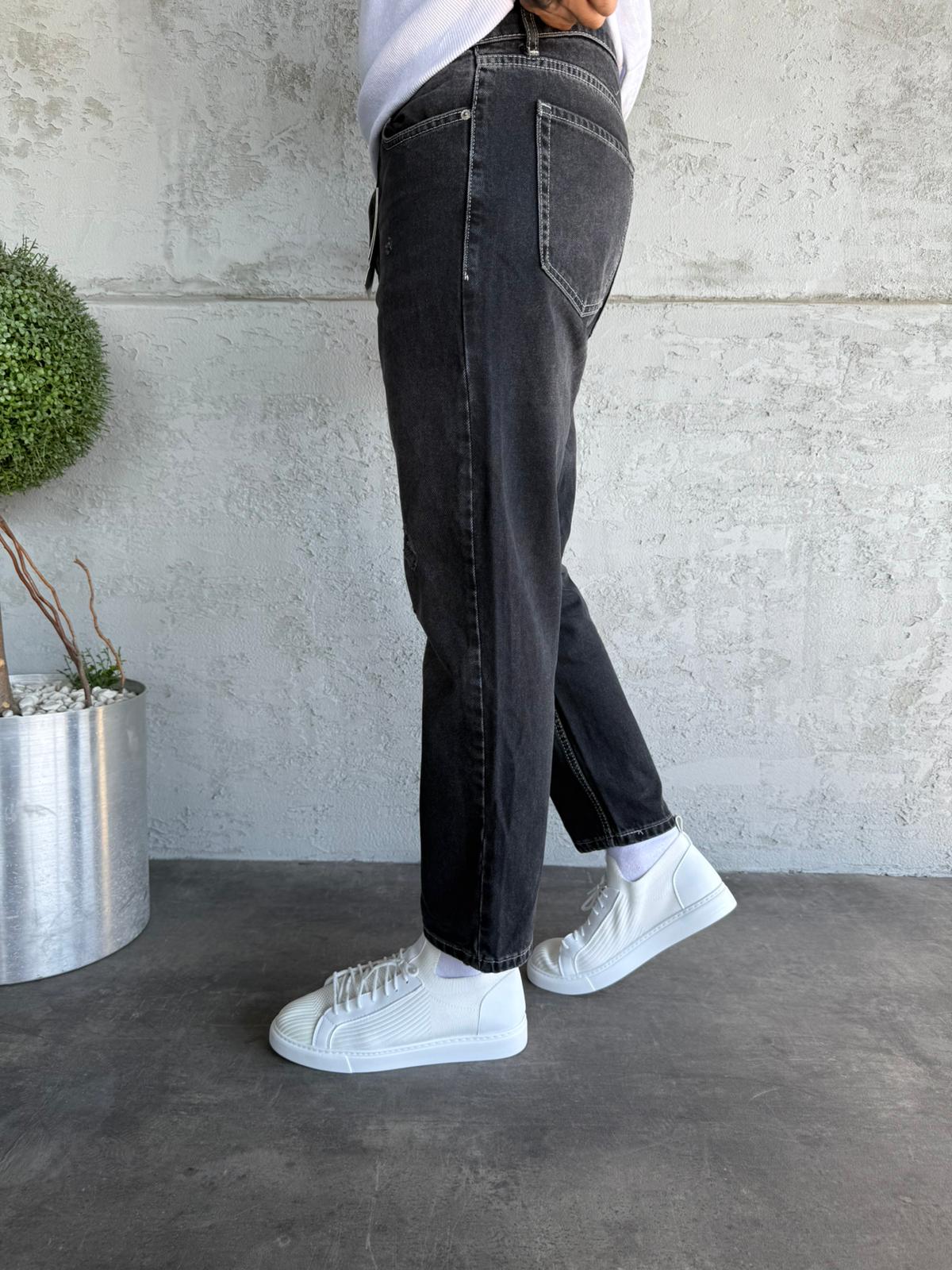 Beyaz Dikişli Lazer Detaylı Füme Boyfriend Jean