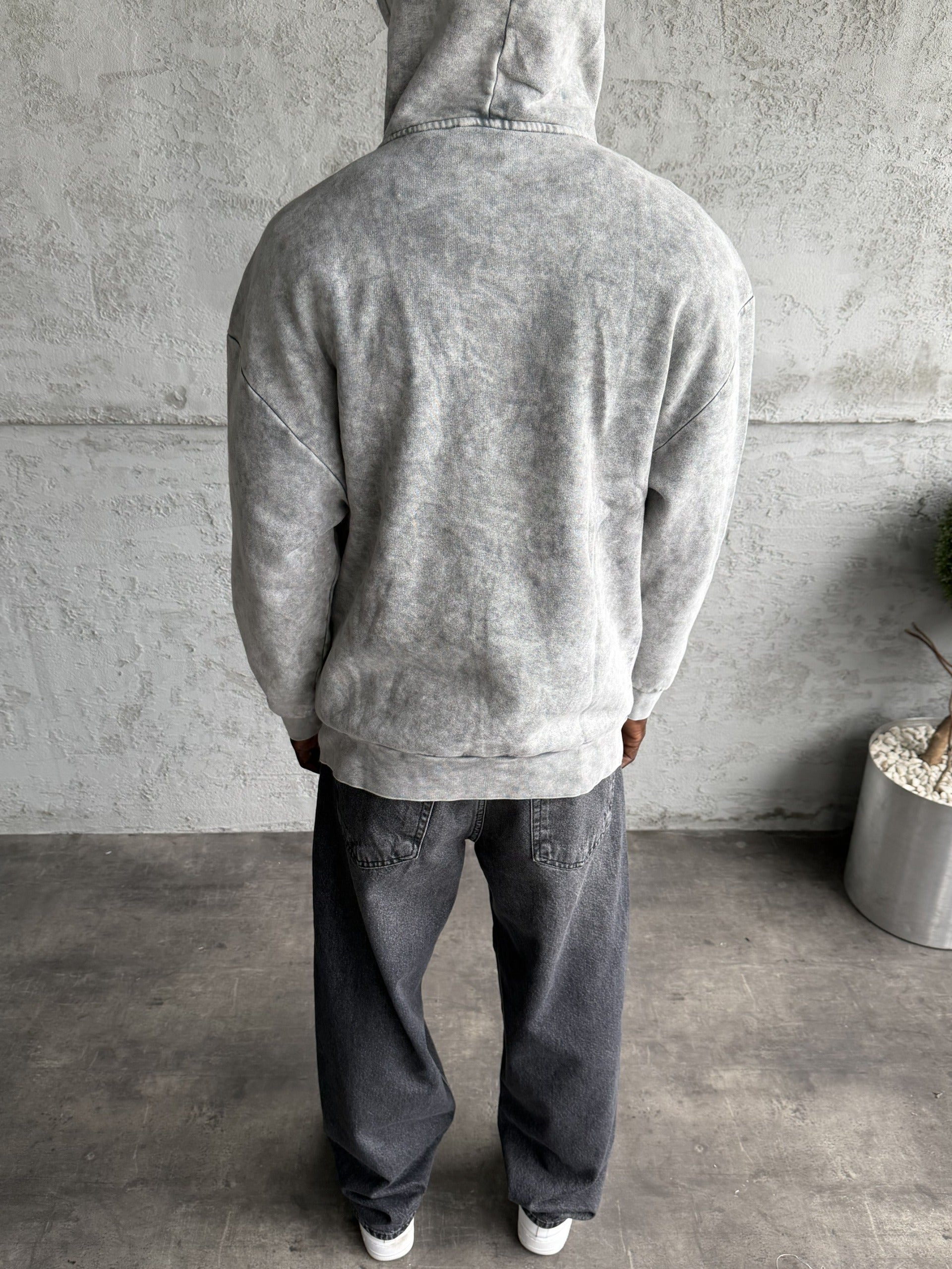 • Açık Gri Yıkamalı Kapüşonlü Nakış Detaylı Sweatshirt