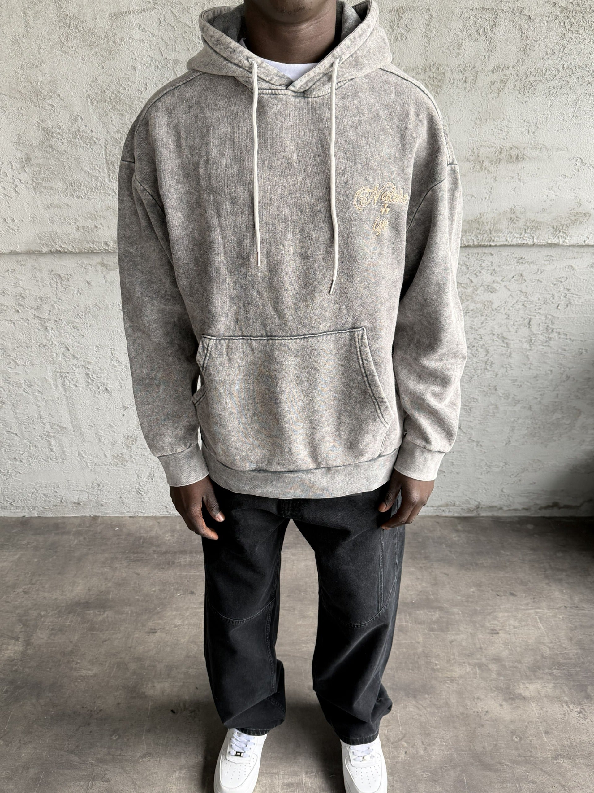 Koyu Gri Yıkamalı Kapüşonlü Nakış Detaylı Sweatshirt