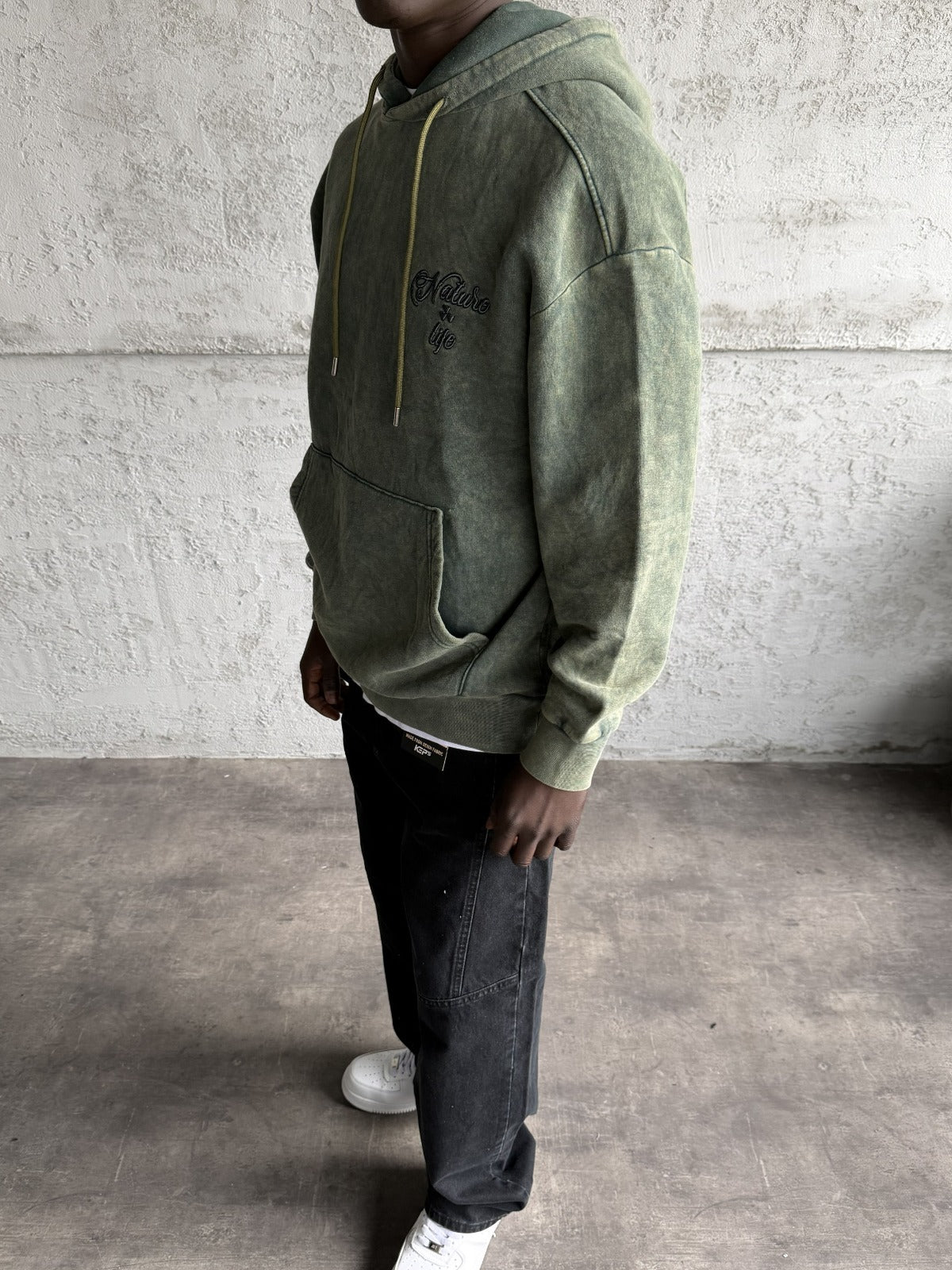 Yeşil Yıkamalı Kapüşonlü Nakış Detaylı Sweatshirt
