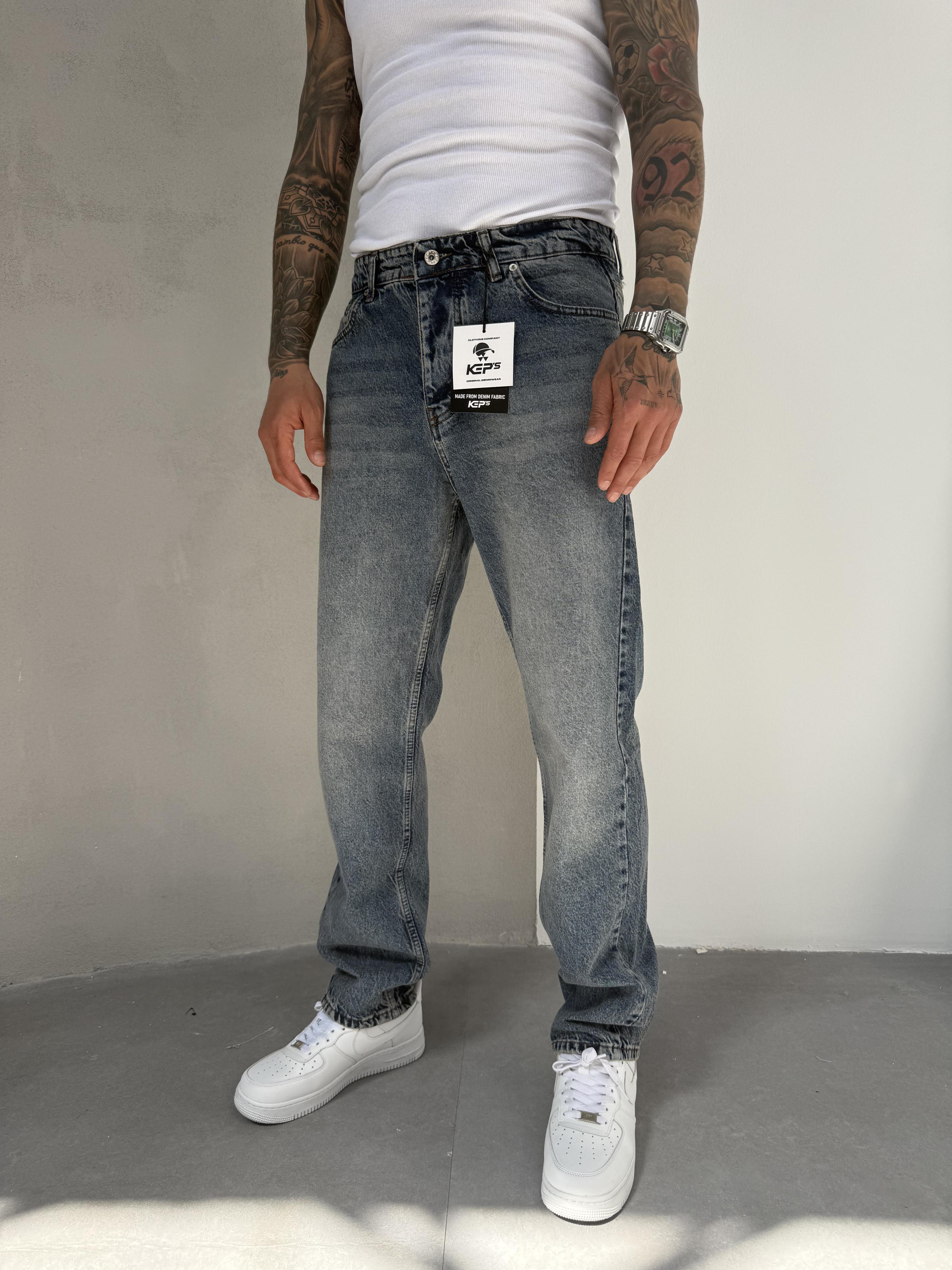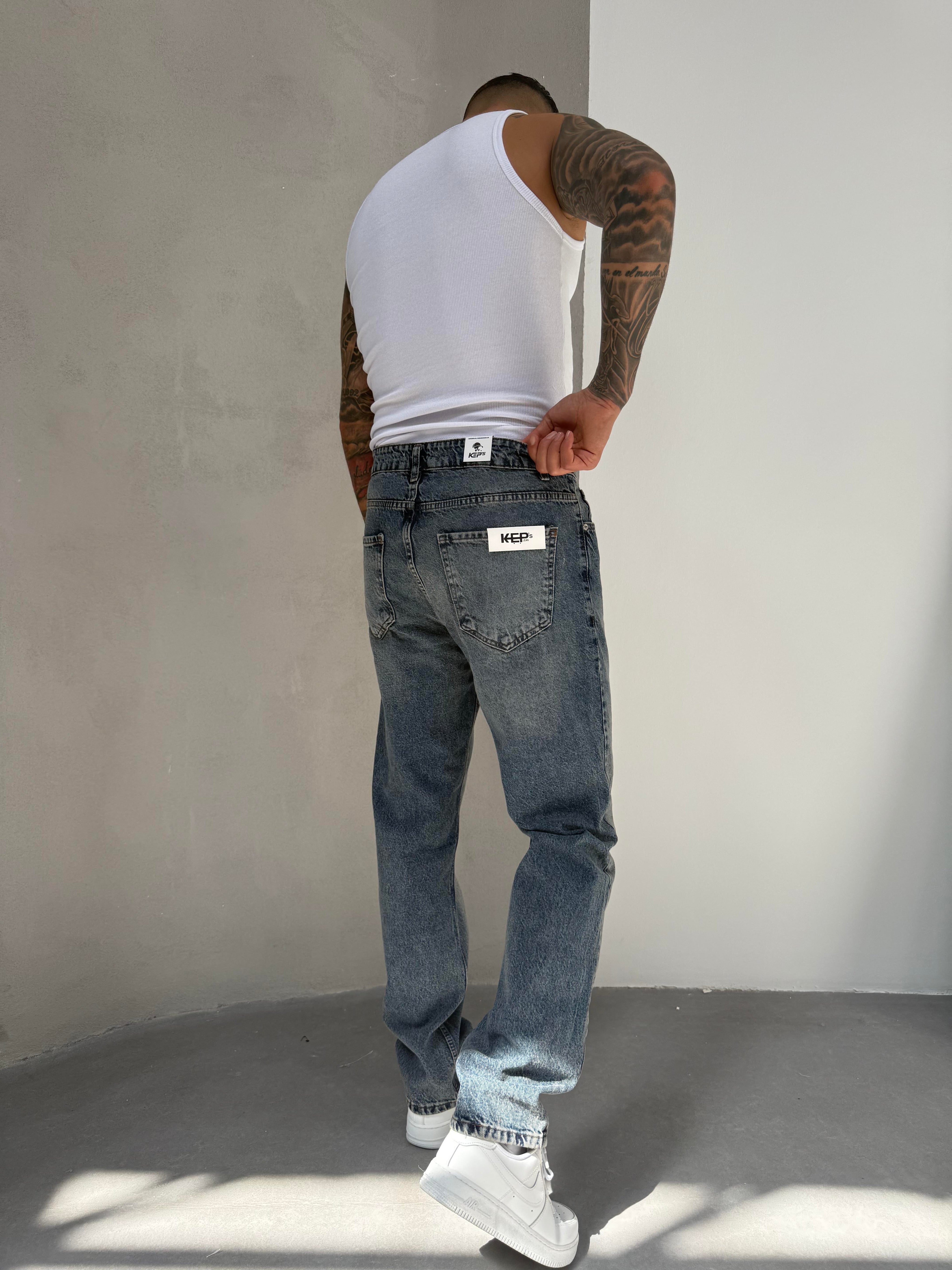 Koyu Lacivert Yıkamalı Yırtıklı Mavi Baggy Jean